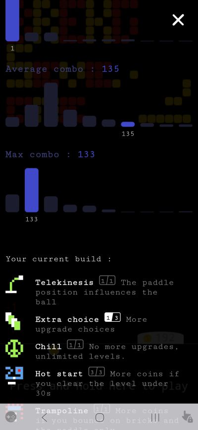 Really enjoying this after you added it to f-droid! I love all the unique upgrades (the new one I tried today was a bit confusing, Unbounded, I thought by 'the sides are removed' the ball would emerge on the other side of the screen, which is not what happened at all, but if you want to create an upgrade that does that with the sides I think that would be fun).